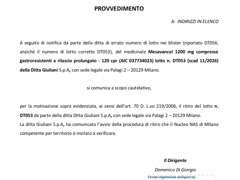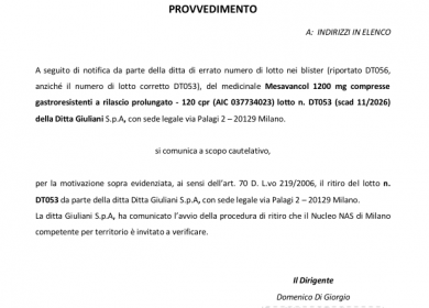 L’Agenzia italiana del farmaco (AIFA), con nota del 21/11/2025, ha comunicato il ritiro, a scopo cautelativo, di un farmaco antinfiammatorio sotto indicato, a seguito di notifica da parte della ditta, di errato numero di lotto nei blister (riportato DT056, anziché il numero di lotto corretto DT053), del medicinale Mesavancol 1200 mg compresse gastroresistenti a rilascio prolungato 120 cpr (AIC 037734023) lotto n. DT053 con scadenza 11/2026 della Ditta Giuliani S.p.A, Mesavancol è un farmaco a base del principio attivo Mesalazina, appartenente alla categoria degli Antinfiammatori e nello specifico Acido aminosalicilico ed analoghi, utilizzato nell’induzione e mantenimento della remissione clinica ed endoscopica nei pazienti con colite ulcerosa da lieve a moderata. Per la motivazione sopra evidenziata, rileva Giovanni D’Agata, presidente dello “Sportello dei Diritti”, si procede in via cautelativa come da comunicazione AIFA al ritiro del lotto n. DT053 anche ai sensi dell’art. 70 D. L.vo 219/2006. La ditta Giuliani S.p.A, con sede legale in via Palagi 2, della città metropolitana di Milano, ha comunicato l’avvio della procedura di ritiro che il Nucleo NAS di Milano competente per territorio è invitato a verificare.