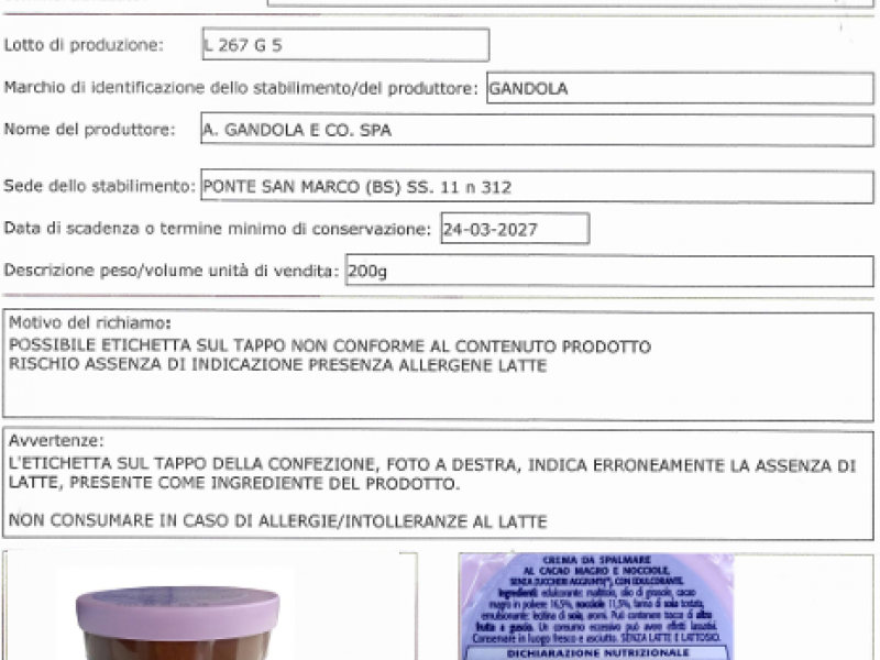 Allergene non dichiarato, richiamata crema da spalmare nocciola e cacao Gandola