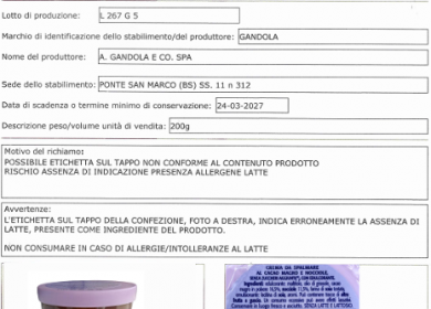 Possibile presenza dell’allergene latte non dichiarato in etichetta. Il problema per la salute è legato alla presenza dell’allergene latte