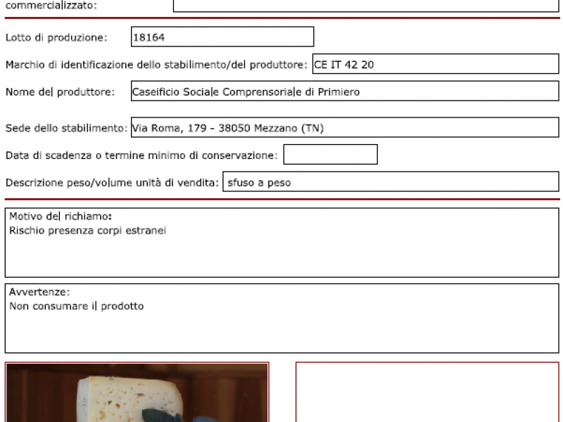 Il Ministero della salute ha diffuso il richiamo di un lotto di formaggio Dolomiti aromatizzato alle erbe del Caseificio Sociale Comprensiorale di Primiero per la possibile presenza di corpi estranei. Nello specifico si tratta del lotto 18164 venduto sfuso a peso con il numero. Il formaggio richiamato è stato prodotto a Mezzano, in provincia autonoma di Trento, dal Caseificio Sociale Comprensiorale di Primiero nello stabilimento di via Roma 179. Nell’ottica d’informazione quotidiana ai consumatori in materia di allerte alimentari, lo “Sportello dei Diritti” nella persona del presidente Giovanni D'Agata, raccomanda, a scopo precauzionale, di non consumare il formaggio con il numero di lotto segnalato.Per visualizzare i richiami del Ministero, basta recarsi sul sito dell'istituzione e cliccare sul link "richiami di prodotti alimentari da parte degli operatori" sotto la voce "Avvisi sicurezza".